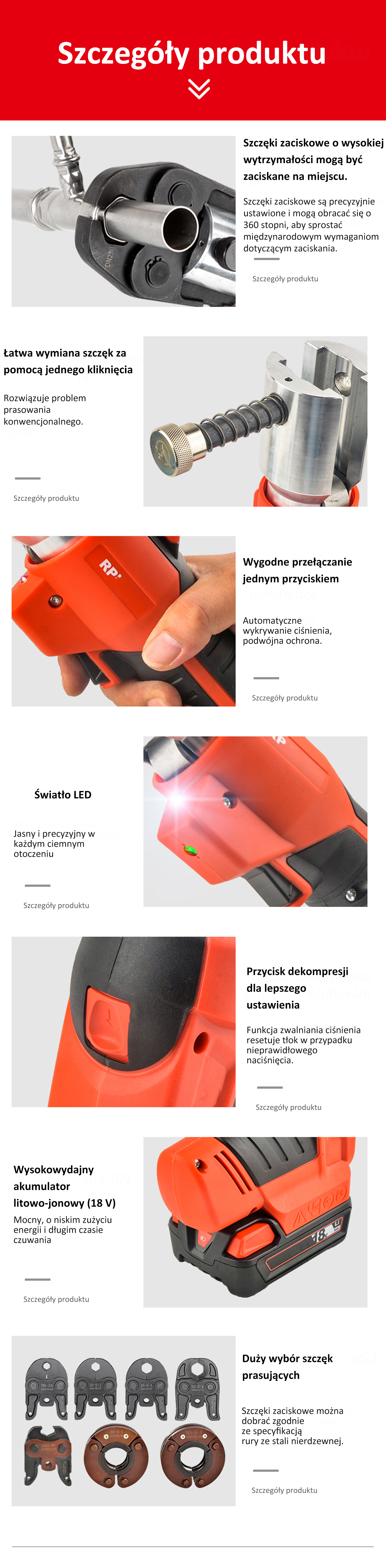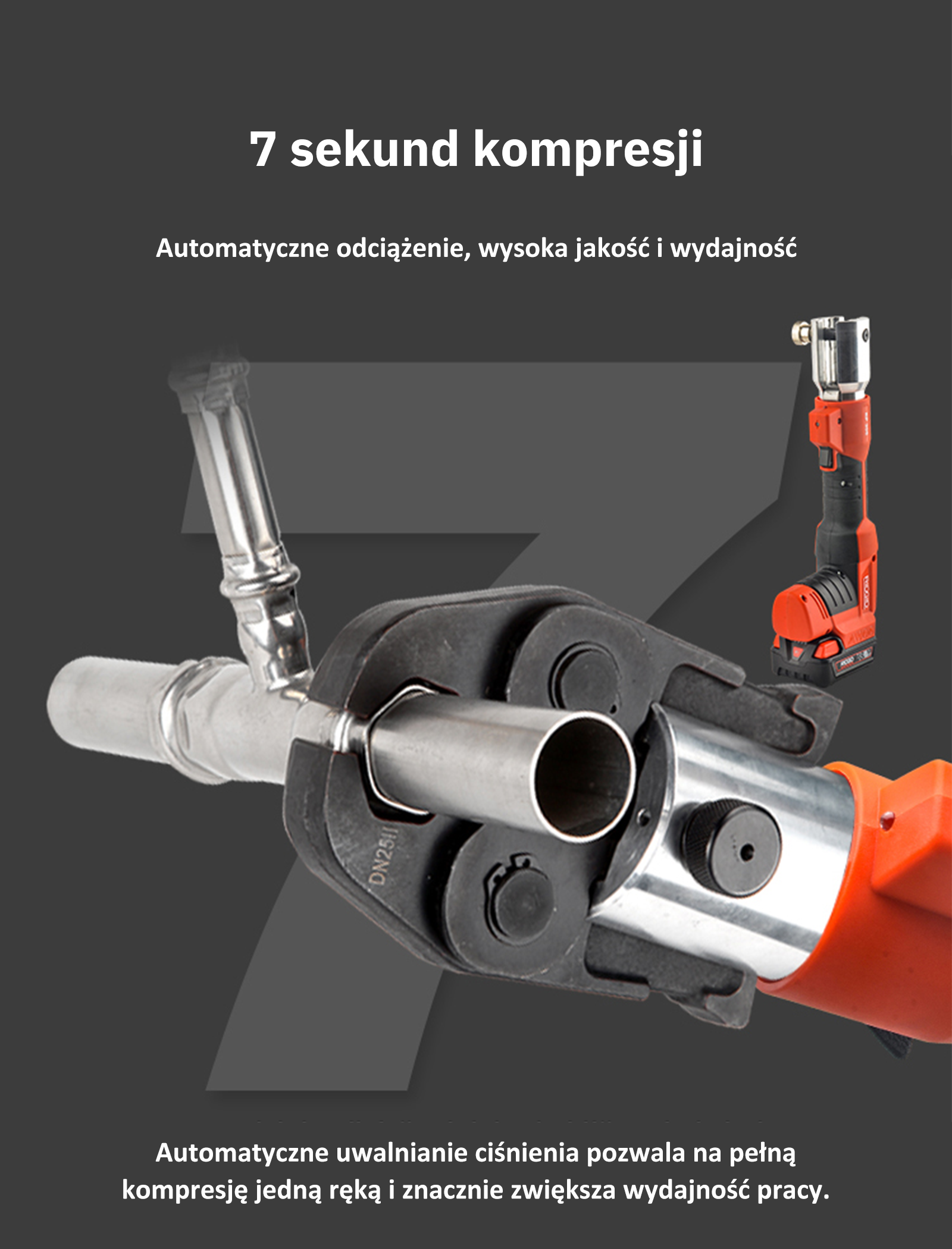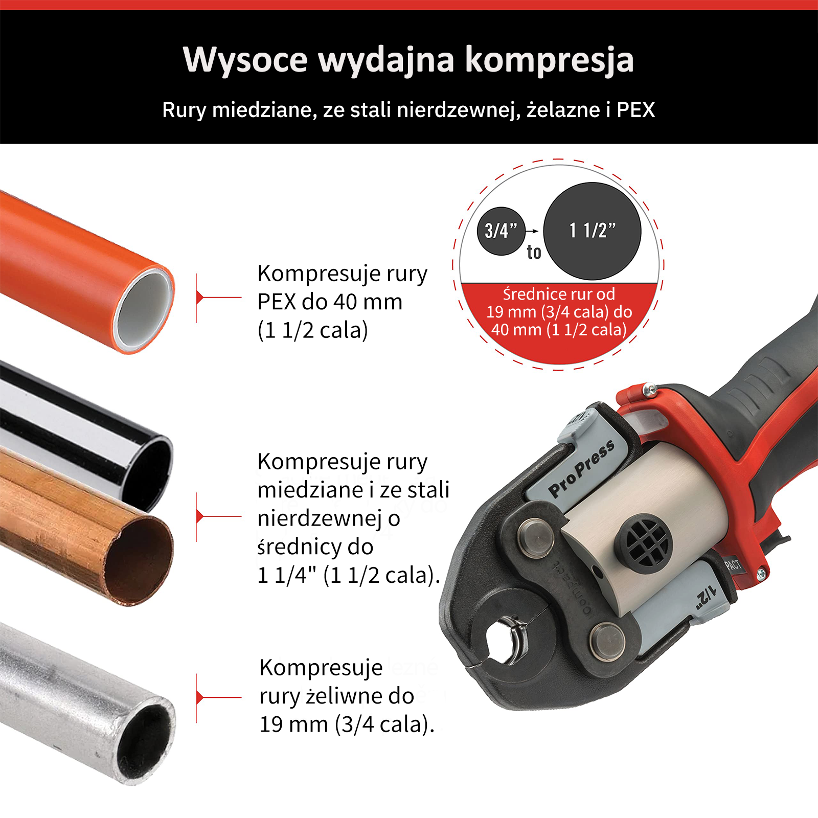 Szybko i łatwo zaciska rury miedziane i ze stali nierdzewnej o średnicy od 1/2 cala do 1,25 cala, rury PEX o średnicy od 1/2 cala do 1-1/2 cala oraz rury żelazne o średnicy od 1/2 cala do 3/4 cala. Pasuje do rur PEX o średnicy od 1/2 cala do 3/4 cala oraz rur żelaznych.
