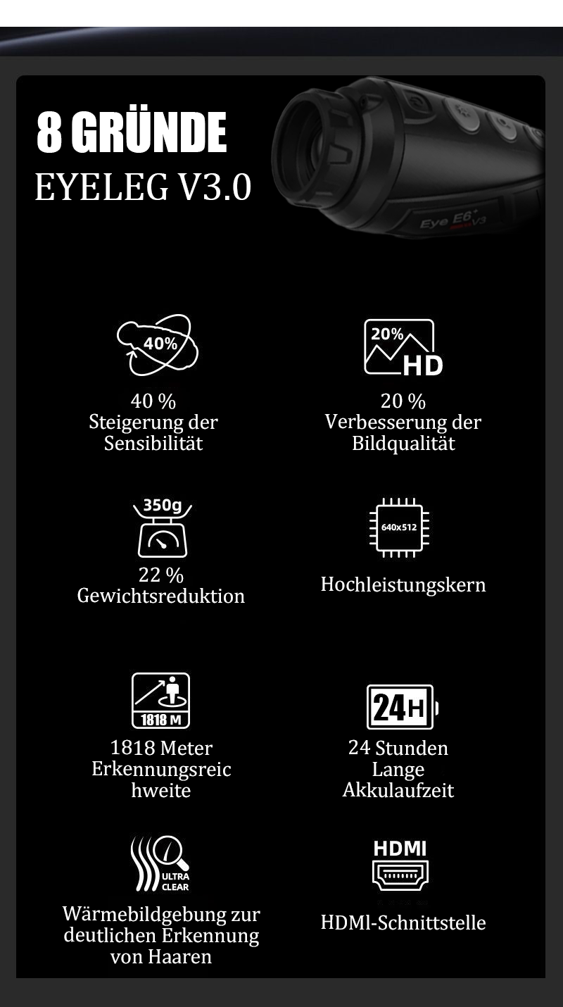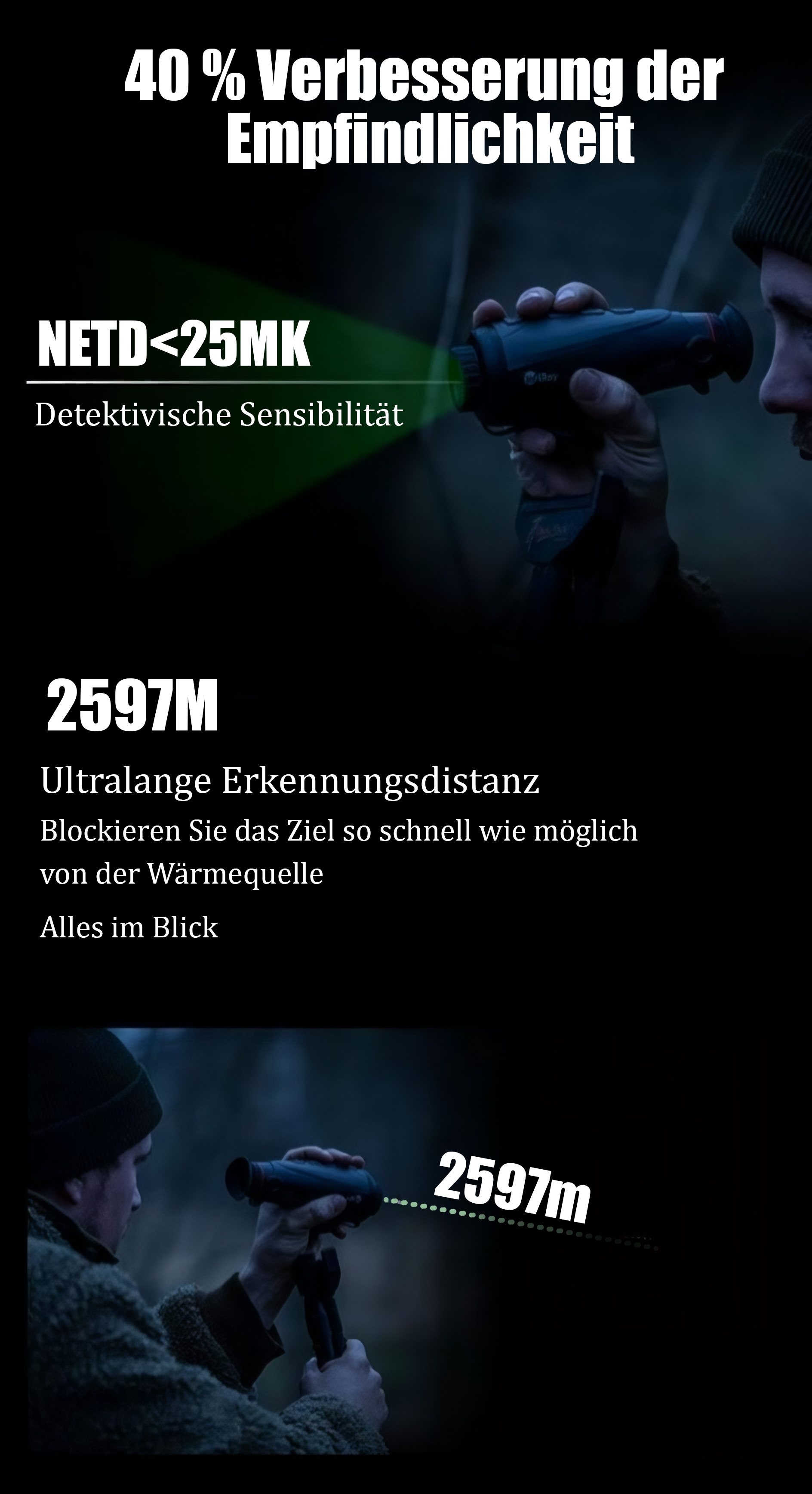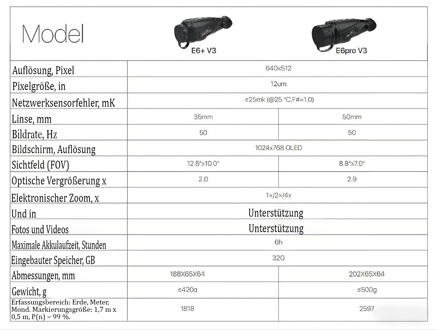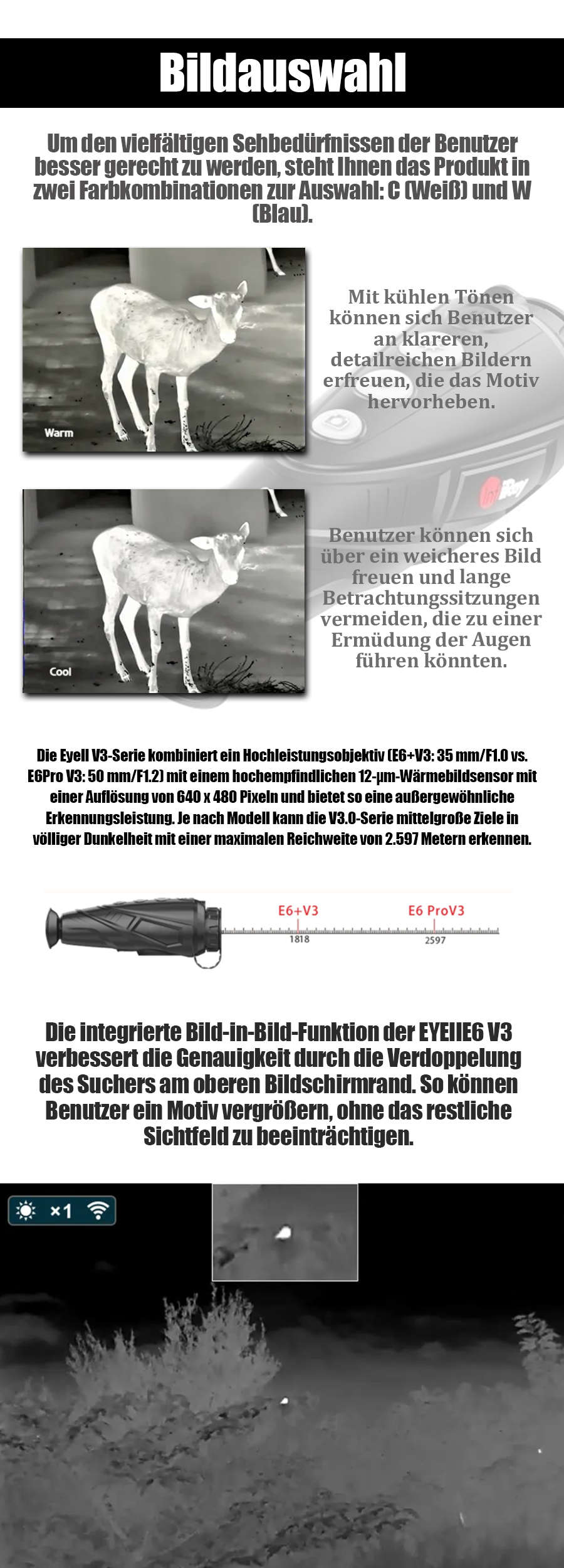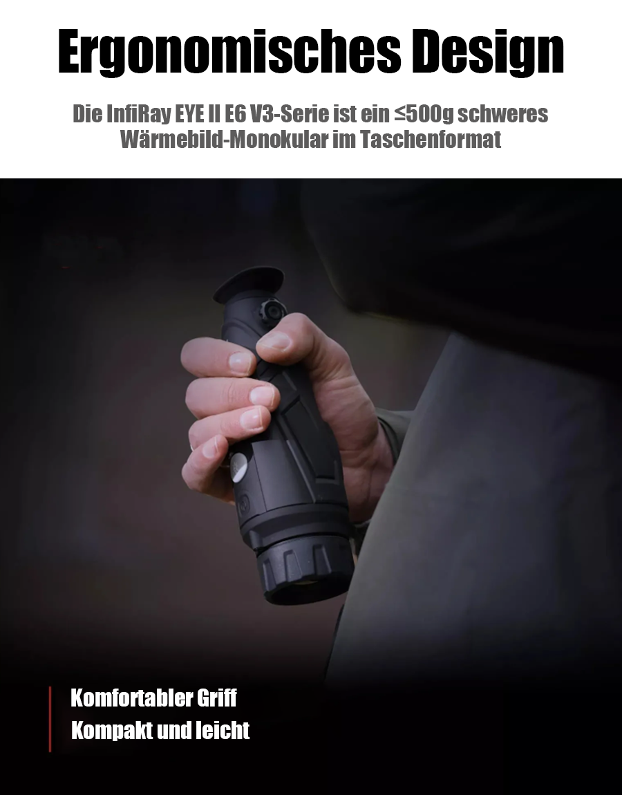 Wärmebildmonokular Eye ll E6+ V3 mit einer Erfassungsreichweite von bis zu 1818 Metern, Eye ll E6 Pro V3 mit einer Erfassungsreichweite von bis zu 2597 Metern.
