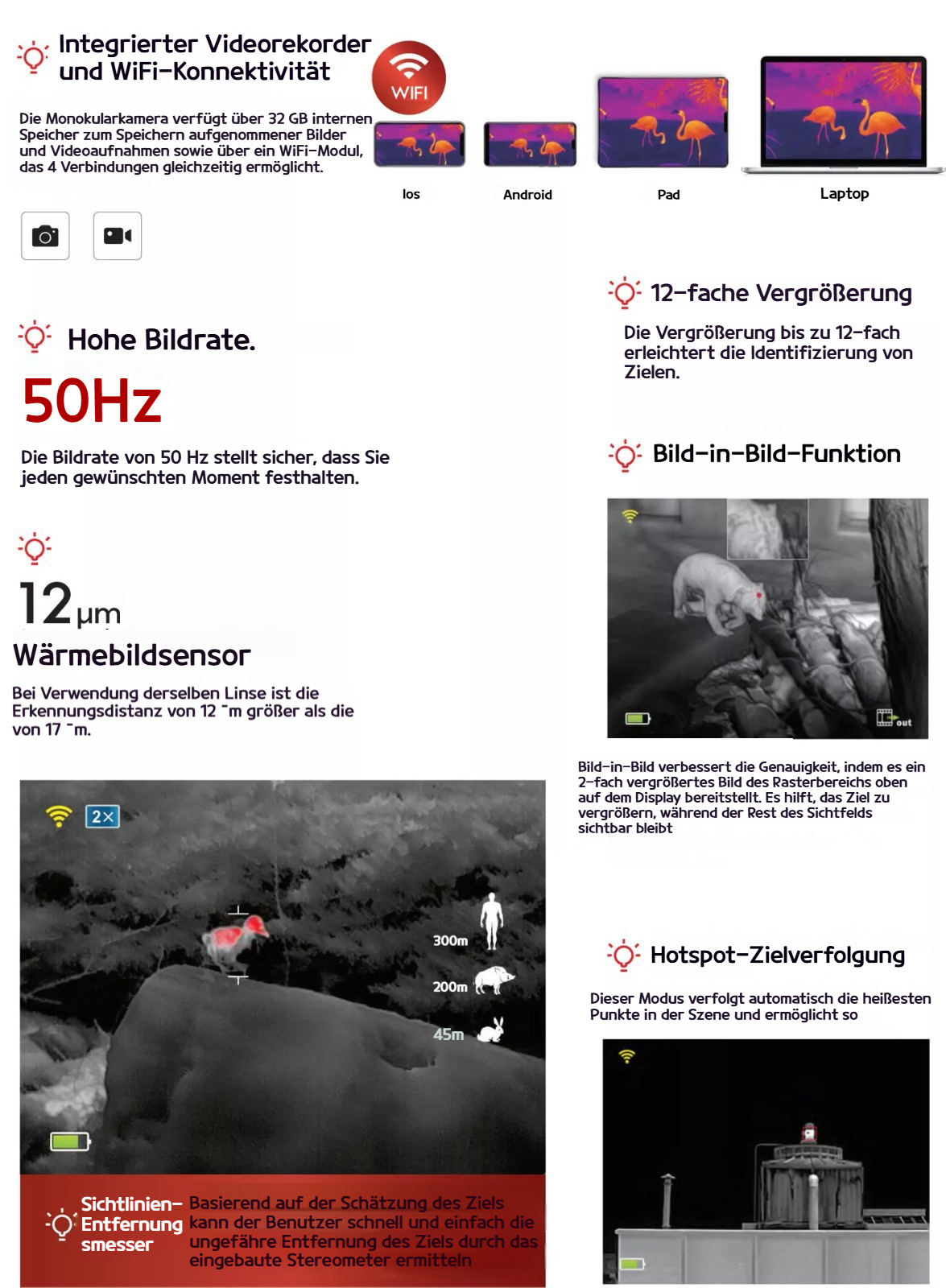 Die Eye Ⅱ E6 V3 Serie ermöglicht Ihnen die Nutzung detaillierter Wärmebildtechnologie, um Ziele in der Dunkelheit leichter zu finden. Die Eye Ⅱ Serie bietet in diesem Temperaturbereich eine hervorragende Leistung.
