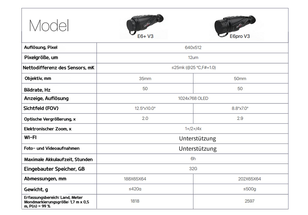 Die Eye II V3 Serie kombiniert ein leistungsstarkes Objektiv (E6+V3: 35 mm/F1.0 vs. E6Pro V3: 50 mm/F1.2) mit einem hochsensiblen Wärmebildsensor mit 640×480 Pixeln und 12 μm Auflösung, um überlegene Erkennungsfähigkeiten zu bieten. Je nach Modell ist die V3.0 Serie in der Lage, mittelgroße Ziele mit Jacke bei völliger Dunkelheit in einer maximalen Erkennungsreichweite von bis zu 2.597 Metern zu detektieren.